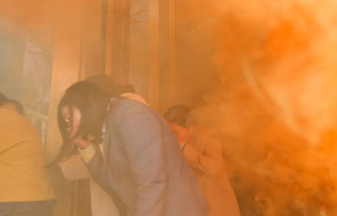 随后在浓浓的烟雾和尖锐的警报声中,全体员工进行了安全逃生演练,根据提前习得的火场自救技能,用湿毛巾或袖子捂住口鼻,在教官的指导下沿着指定线路弯腰快速、有序“疏散”至产业园区前的大坪,开始消防安全的实践操作。
